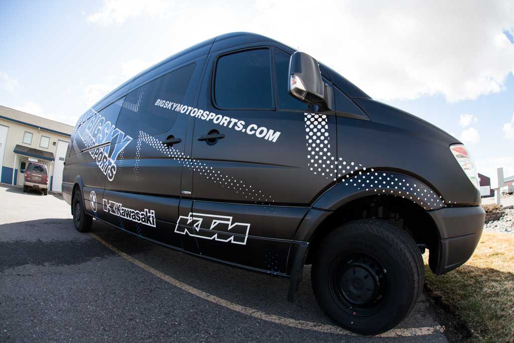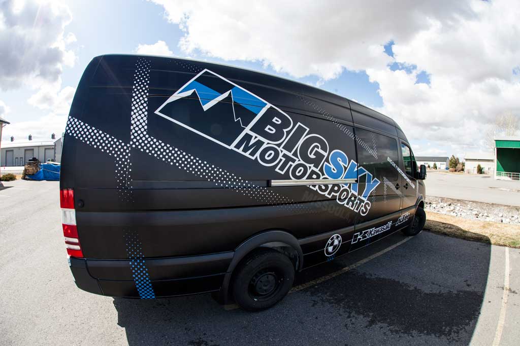 Big Sky Motorsports, Montana’s Motorcycle Headquarters, is utilizing the marketing space available on their all-new Dodge Sprinter Van by fully wrapping it! The team from BSMS came to SCS recently and wanted to transform this standard, white Sprinter Van into an eye-catching, race-type, looking vehicle. The SCS Wraps design team developed a look that could not have pleased our client any more. The end result is a completely new looking vehicle that is benefiting Big Sky Motorsports 24/7/365. This vehicle will be out supporting local races in Montana and other regional stops so please keep your eye out so that you can see the impact that this vehicle wrap really has. If you are interested in transforming a company vehicle into a great advertising piece, please do not hesitate to contact SCS Wraps today at 406-585-2635 or info@scswraps.com.