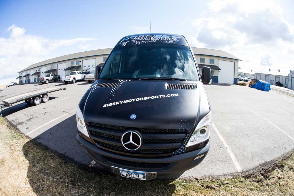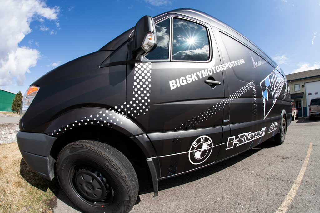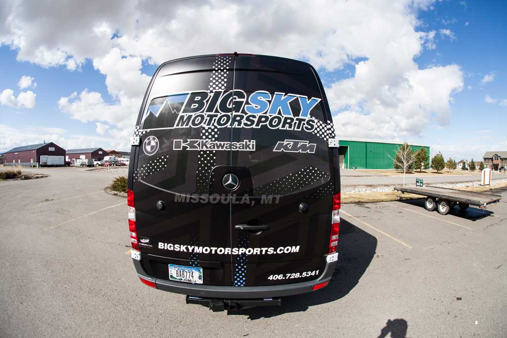 Big Sky Motorsports, Montana’s Motorcycle Headquarters, is utilizing the marketing space available on their all-new Dodge Sprinter Van by fully wrapping it! The team from BSMS came to SCS recently and wanted to transform this standard, white Sprinter Van into an eye-catching, race-type, looking vehicle. The SCS Wraps design team developed a look that could not have pleased our client any more. The end result is a completely new looking vehicle that is benefiting Big Sky Motorsports 24/7/365. This vehicle will be out supporting local races in Montana and other regional stops so please keep your eye out so that you can see the impact that this vehicle wrap really has. If you are interested in transforming a company vehicle into a great advertising piece, please do not hesitate to contact SCS Wraps today at 406-585-2635 or info@scswraps.com.